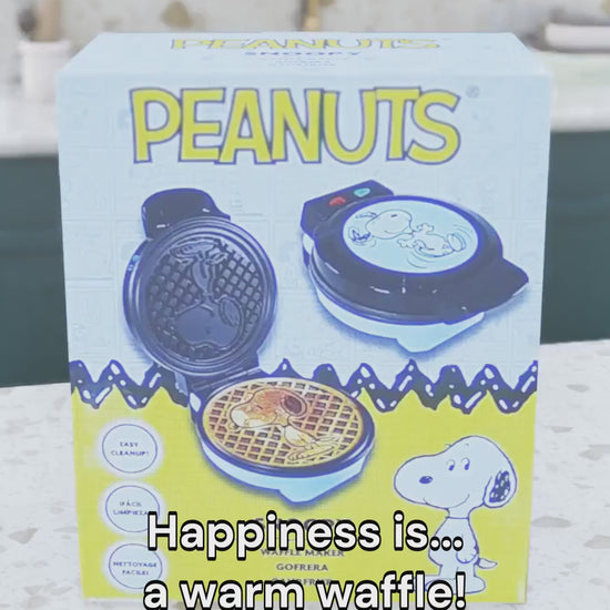 All Peanuts fans will love our Peanuts Snoopy Waffle Maker. Whether you like them brown and crispy or tender and golden, the regulated thermostat and weighted lid ensure even heating, while the dual indicator lights make adding batter and removing the finished product easy. More than just a waffle iron, this can also be used to make eggs, brownies, cakes, quesadillas, or even as a Snoopy sandwich press. The waffle maker is compact, easy to use, and easy to clean.